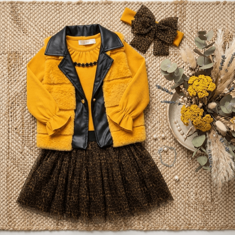 Le Gilet Sans Manches : En fausse fourrure ultra-douce jaune, avec des empiècements en similicuir noir pour un style « rock-chic » moderne.